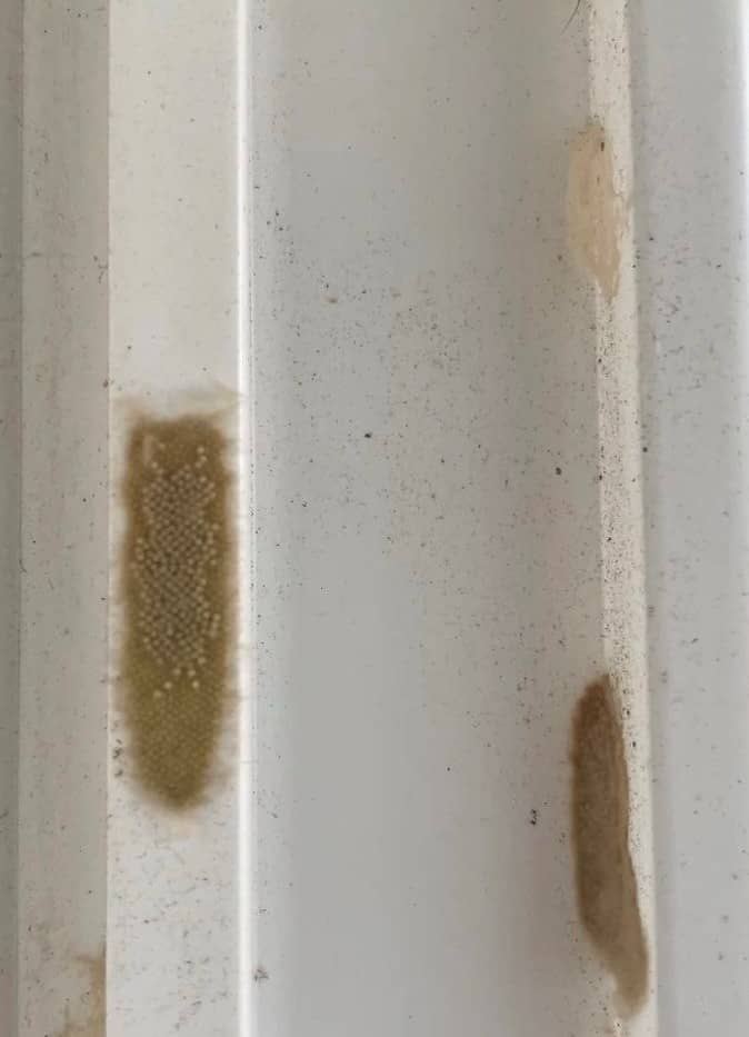 Egg masses appear as cream to pale-brown clusters on walls, posts, fences, sheds, and eaves. They resemble small fuzzy patches or flattened pads and are often laid near outdoor lights. They may appear moist when fresh and dry to a papery texture as they age.
